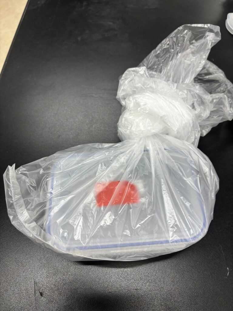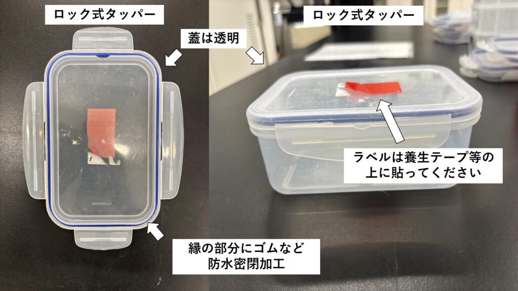 宅配便などの一般の搬送業者をご利用の場合。タッパーをビニール袋で包んでから段ボールなどの外装容器に入れて下さい。検体ラベルは内部のタッパーとビニール袋の両方に貼付して下さい。